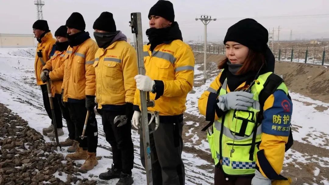 受前⼏⽇暴雪天⽓影响,有些检查区段⻋辆⽆法到达,只能靠段轨道⻋运送前往。依撕⽶特拉·艾⻨提和同事们仔细检查线路的道岔、钢轨、轨枕等线路设备,确保列⻋安全稳定运⾏。