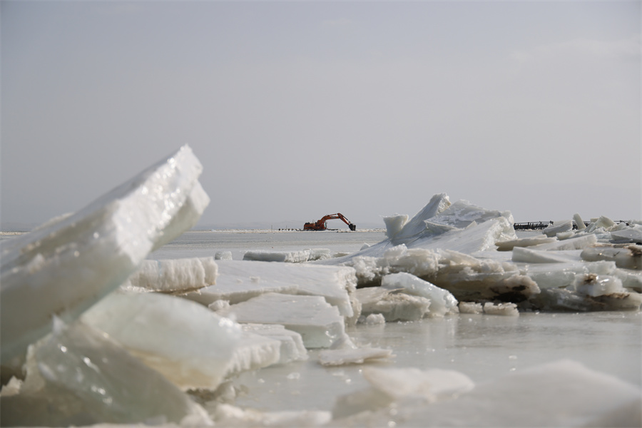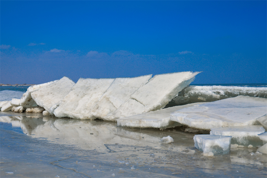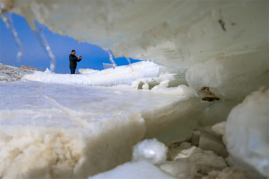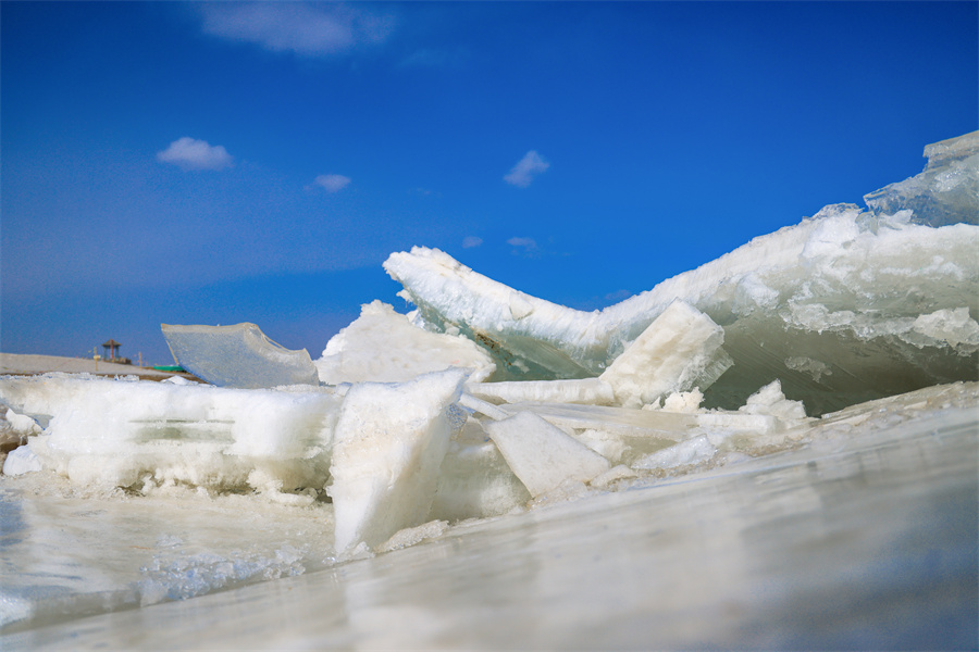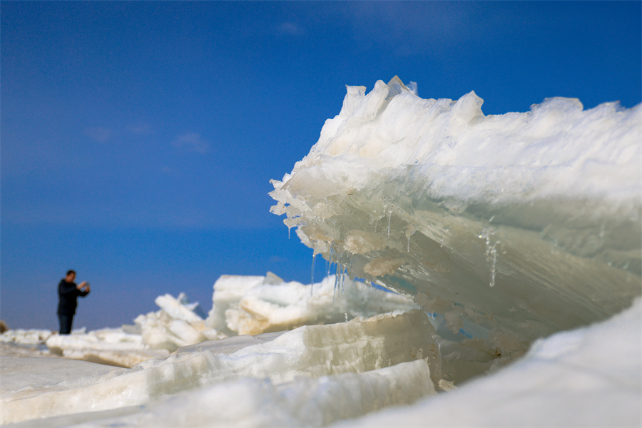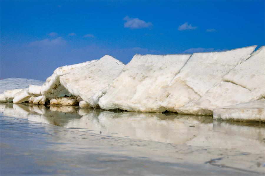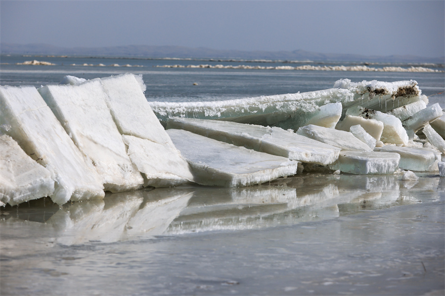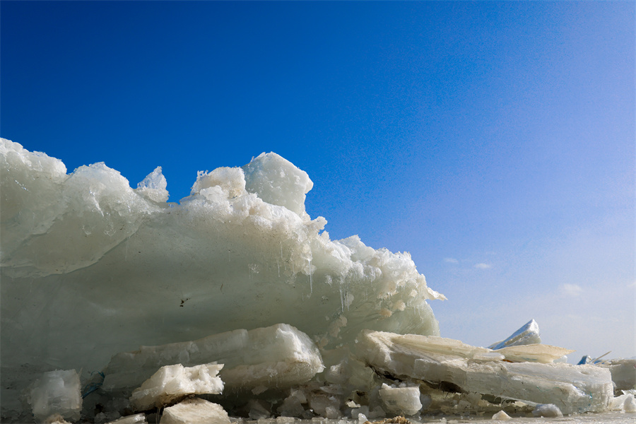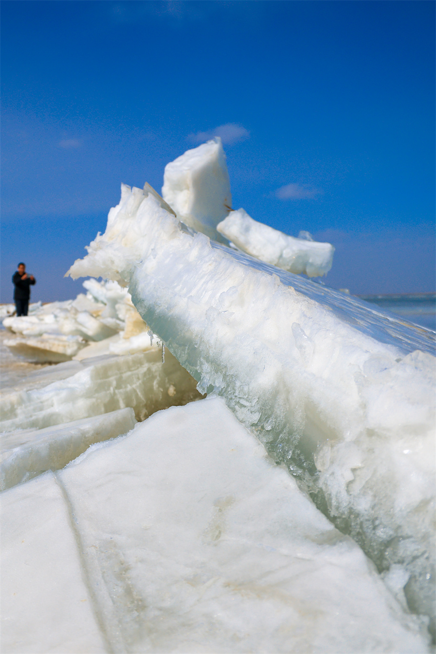 2月28日,在博斯腾湖畔,推冰如同一座座小型冰山,连绵不断,组成了一条“冰雪山脉”,有的如“木屋”、有的如“驼峰”,最高处推起2米多高,绵延数公里,各种造型奇特的“冰山”蔚为壮观,吸引摄影爱好者和游客前来观赏拍摄。(年磊)