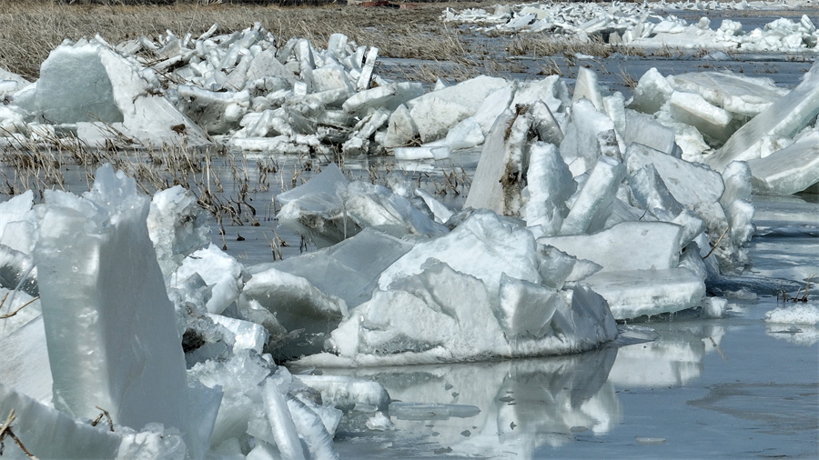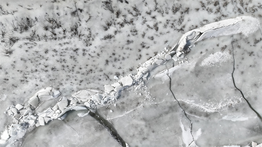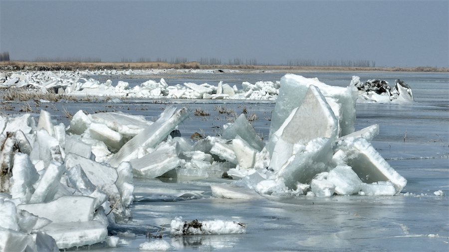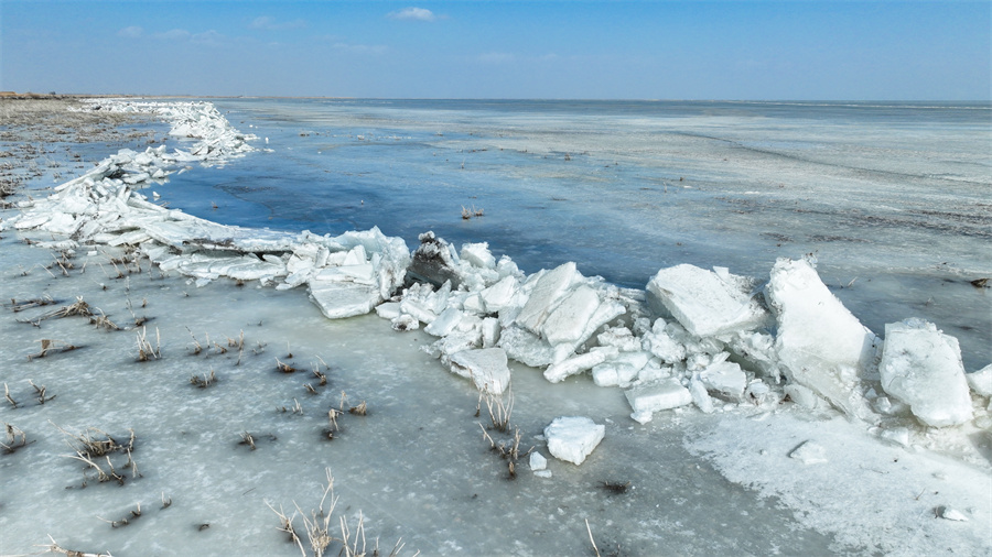 入春以来,随着气温不断回升,位于新疆维吾尔自治区巴音郭楞蒙古自治州博湖县境内的博斯腾湖经过冬日“长眠”,厚厚的“冰盖”开始融化,在风和湖水的作用下出现推冰景观。