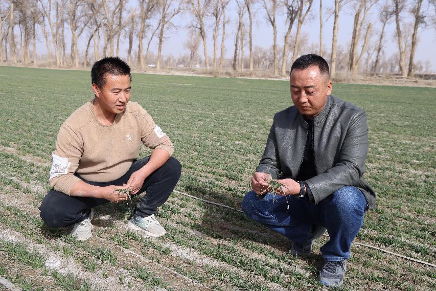 3月20日,二十二团十连特聘农技员秦利科在职工彭利福条田地里查看冬小麦的返青情况。看着一行行茁壮的麦苗,彭利福对今年冬小麦丰产丰收信心十足。