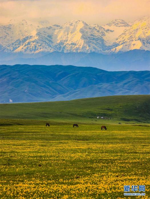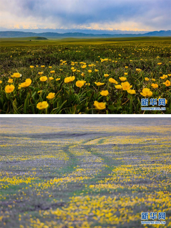 初夏时节,天山脚下金灿灿的金莲花