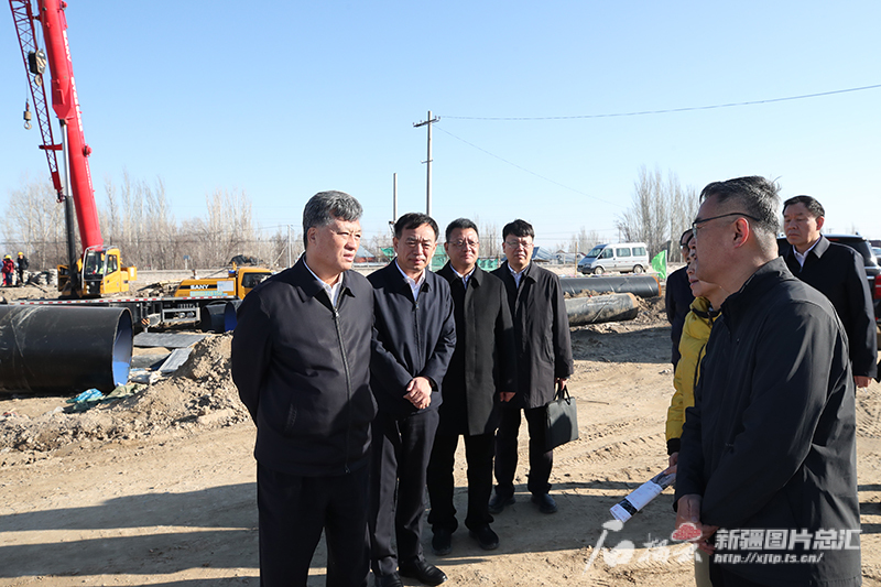 3月26日,自治区党委书记马兴瑞在察布查尔锡伯自治县扬水工程施工现场,听取高标准农田和水利工程建设情况介绍。石榴云/新疆日报记者 崔志坚摄