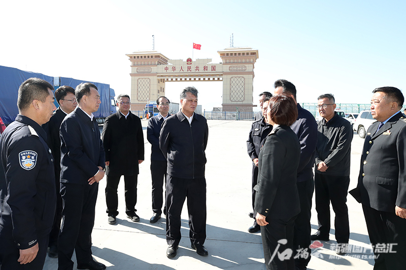 3月26日,自治区党委书记马兴瑞在都拉塔口岸国门,了解口岸通关能力整体提升情况。石榴云/新疆日报记者 崔志坚摄