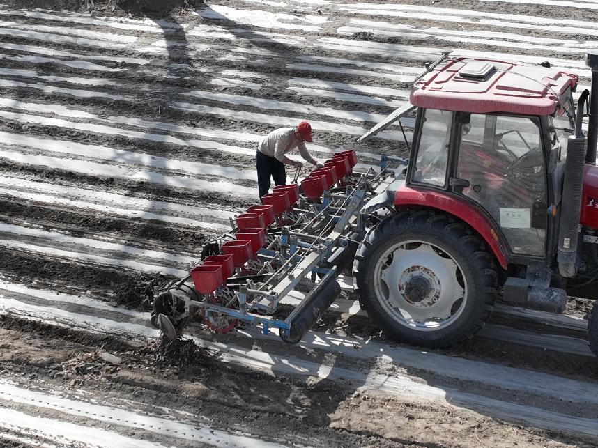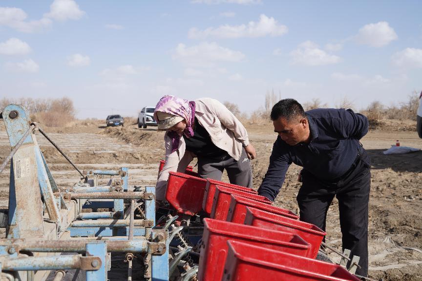 3月26日,在新疆兵团第二师三十四团十连,一台棉花播种机在北斗卫星导航的精准定位下正在田间穿梭,进行冬季铺膜膜下滴水冬灌错时套播棉花作业。地头上,三十四团十连党支部书记潘明俊正在和种植户刘小会一起仔细察看播种情况,补足播种机上的棉种。