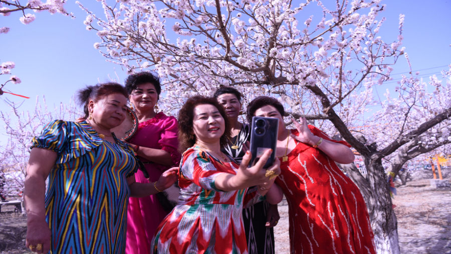 “春有约,花不误,年年岁岁不相负”。库都克村的千亩杏园里,杏花竞相吐蕊,花满枝头,雪白或粉嫩的花瓣在春日暖阳的映照下,形成一片温馨浪漫的花海。来自疆内外的游客如期而至,在杏林里赏花拍照,乐在其中。来自库尔勒的游客买买提·热合曼每年杏花开时都会前来轮台打卡赏花,“看看花,拍拍照,看看演出,心情特别好!”