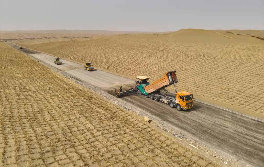 为最大限度减少风沙等自然环境对项目建设造成的影响,该项目团队还通过技术创新,将新发明的“一种用于沙漠地区公路施工的临时阻沙装置”等4项专利首次运用到项目建设中,同时采取“芦苇方格+芦苇栅栏”防风固沙技术,利用芦苇等原材料在全线道路路基铺设草方格和栅栏,有效阻挡了风沙的侵袭。