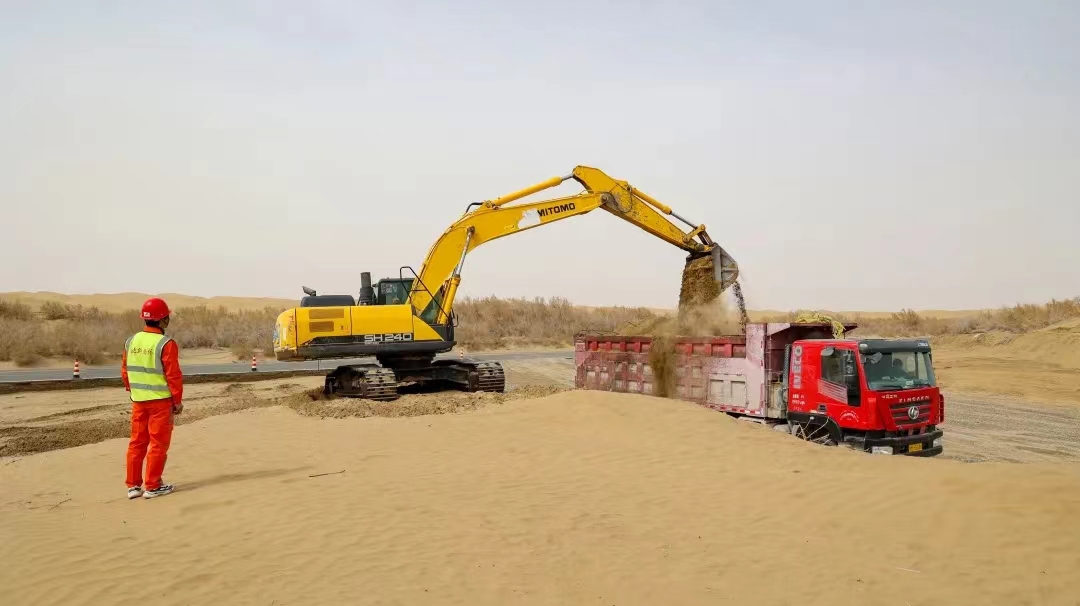 这是在兵团二师三十八团—塔中沙漠公路项目标尾段的施工现场。