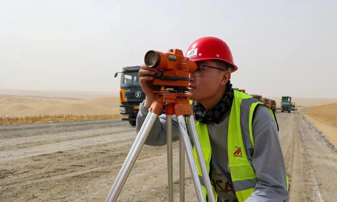 沙漠公路项目是“00后”技术员曹家俊大学毕业后参与的第一个项目,他主要负责项目的测绘工作。而在沙漠里搞测绘,就必须要学会跟风沙打交道。
