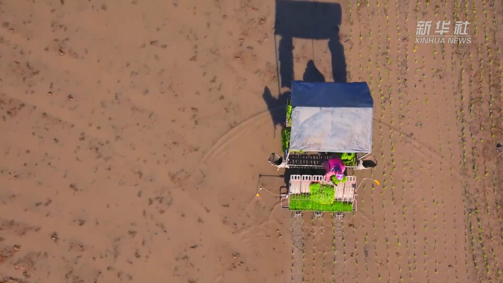 稻田的另一头,插秧机从稻田缓慢驶过,田地里即刻插上一行行等间距的秧苗。插秧机开不到的稻田边角,种植户们正在人工插秧,不一会儿,水田便披上了一袭绿衣。