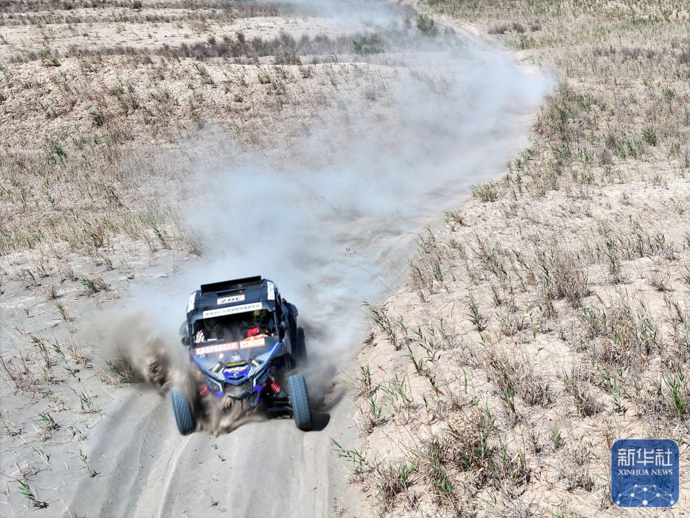 ↑5月21日,英国贝尔润滑油极道体育车队车手王庆喜、领航员郭峰驾驶车辆在比赛中(无人机照片)。新华社记者 张啸诚 摄