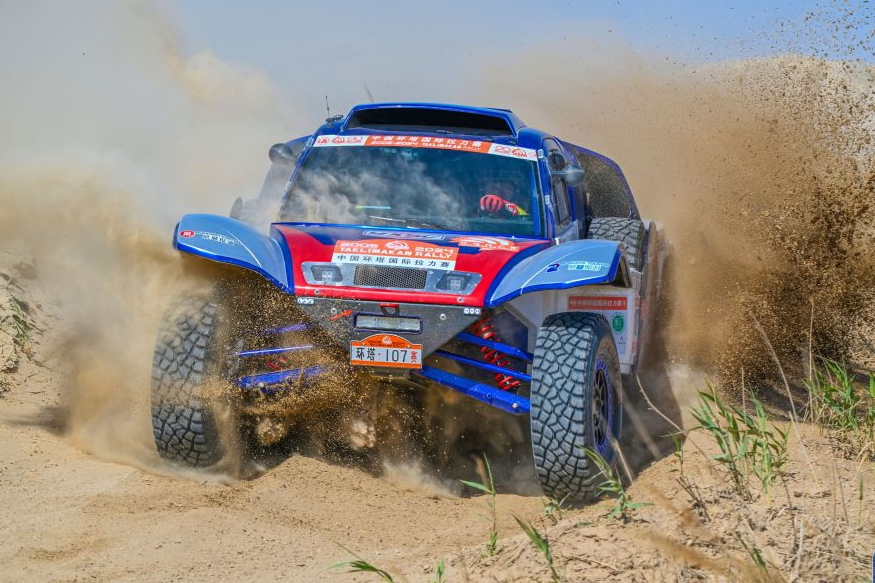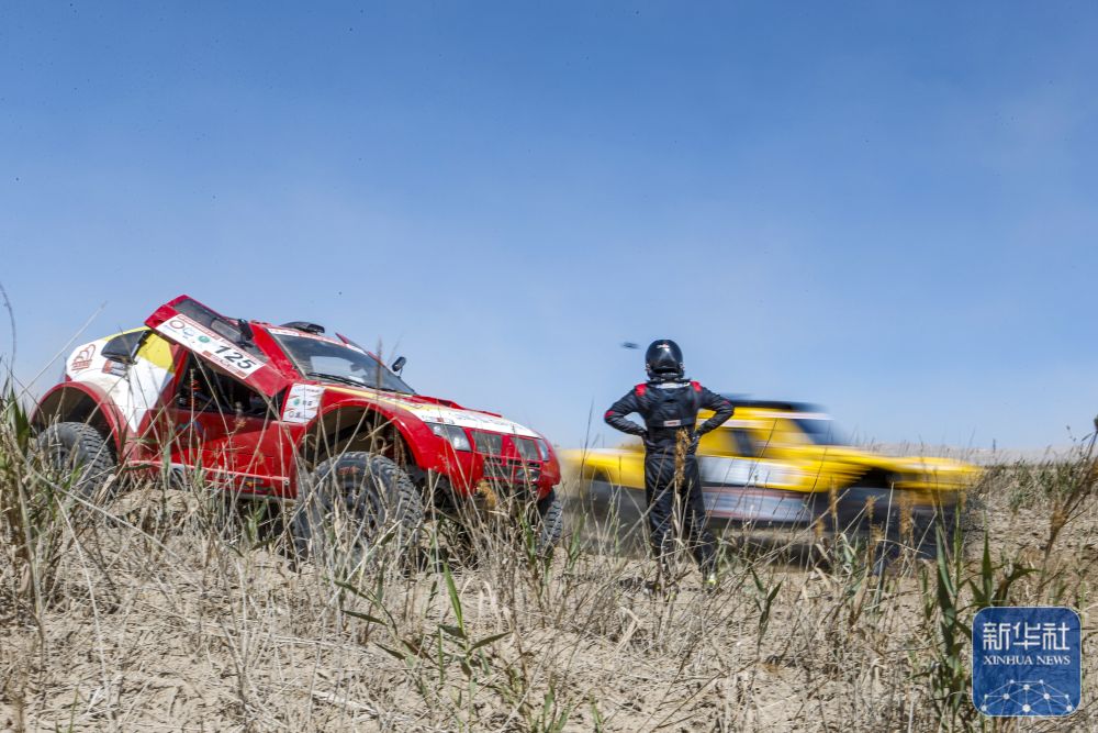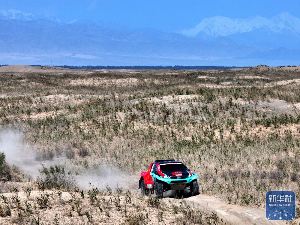 ↑5月21日,新疆八一钢铁车队车手左小兵、领航员瞿山舜驾驶赛车在比赛中。新华社记者 陈朔 摄