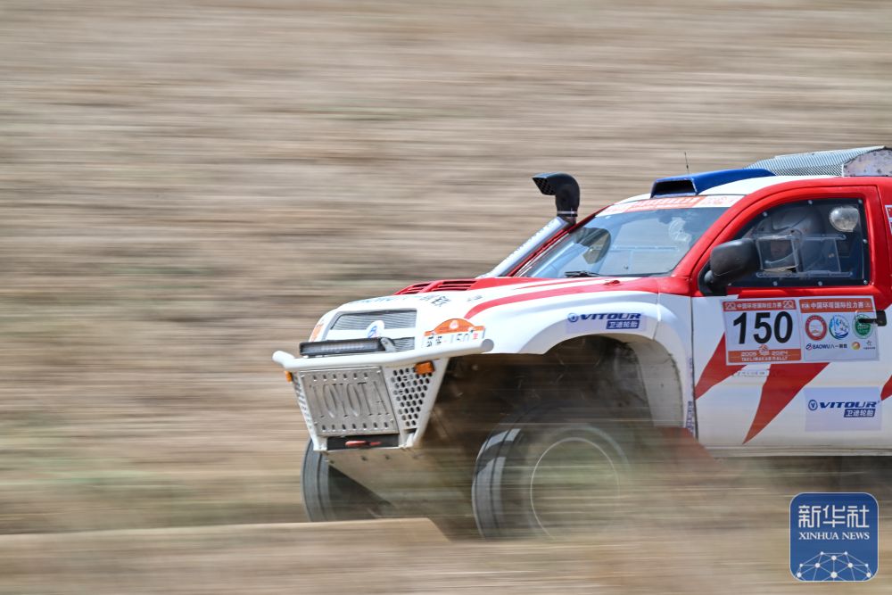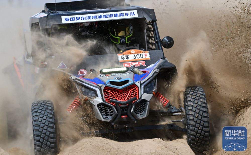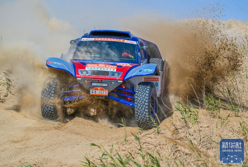 ↑5月21日,陕西云翔汽摩运动有限公司车手訾云亮、领航员沙贺驾驶赛车在比赛中过弯。新华社记者 陈朔 摄