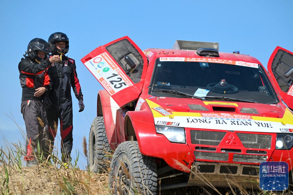 ↑5月21日,黑龙江龙嘉先越拉力艺车队车手汪海(右)、领航员徐宝满车辆发生故障。新华社记者 陈朔 摄