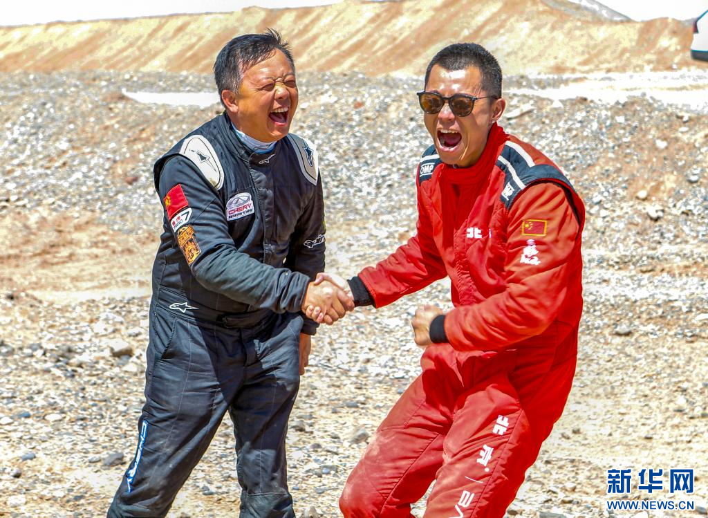5月30日,北京汽车车队中国车手陈震(右)和奇瑞赛车队中国车手陶鹏飞在完赛后庆祝。新华社记者 陈朔 摄