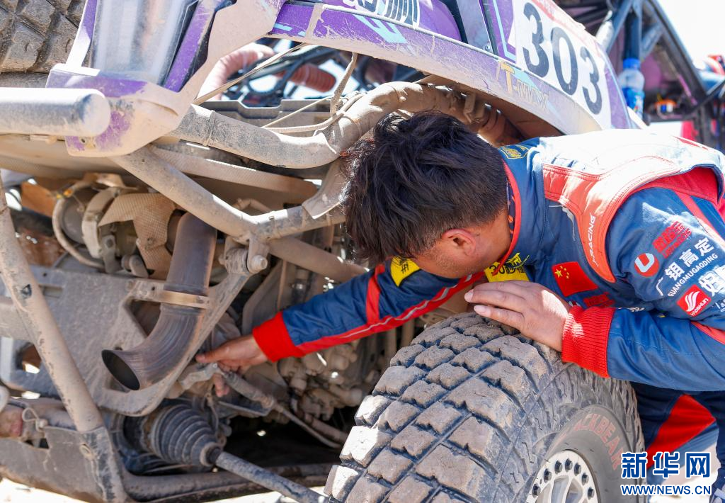 5月30日,黑熊轮胎SPEED-UTV车队中国车手王翔、领航员杨涛的车辆出现损坏,王翔对赛车进行检查。新华社记者 陈朔 摄