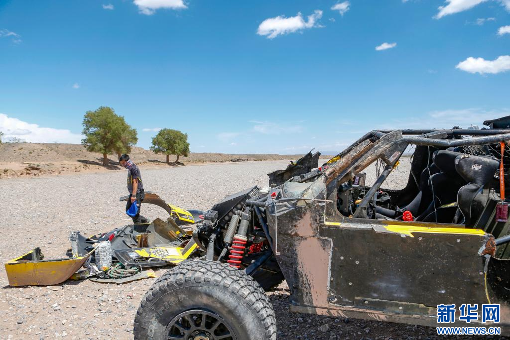 5月30日,韩魏汽车运车队中国车手李大治、领航员王先晨的赛车发生事故后,车队后援工作人员在捡拾遗落的零件。新华社记者 陈朔 摄