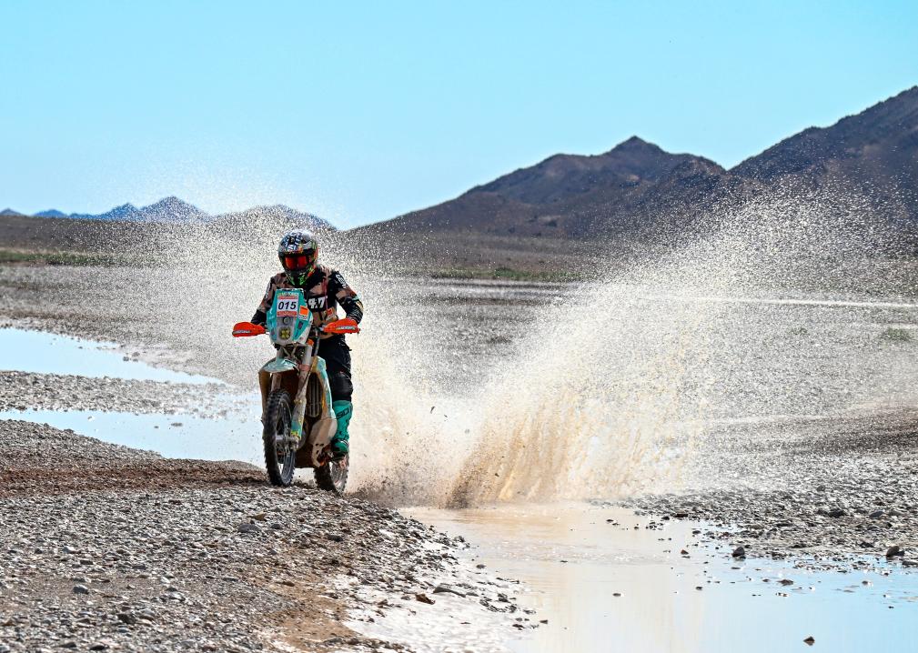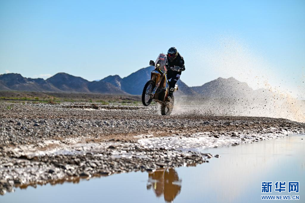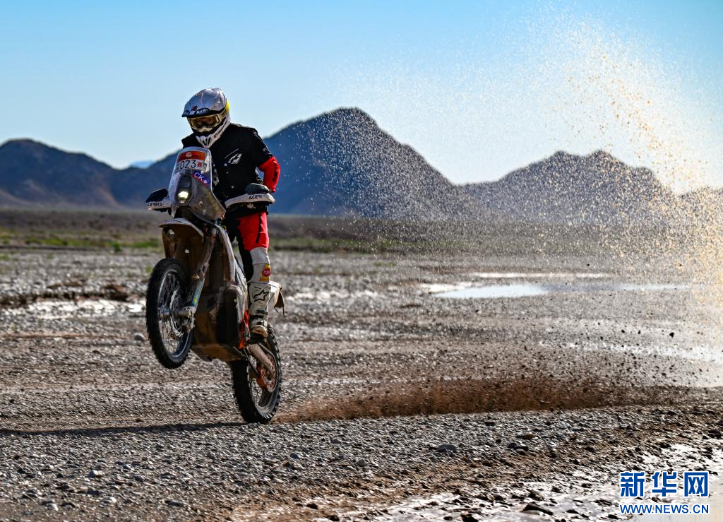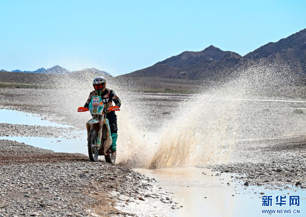 5月30日,古岳拉力车队中国车手阿尤布·马伟笑在比赛中。新华社记者 陈朔 摄