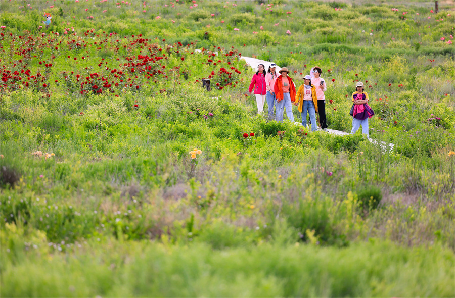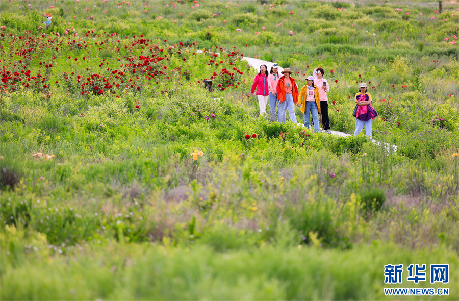 5月30日,游客在新源县喀拉布拉镇玫瑰小镇观光园千亩花海中赏花、游玩。