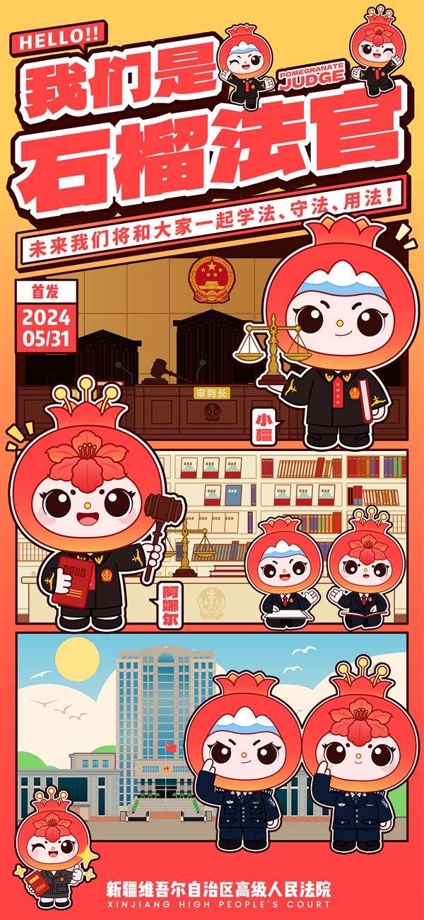 本次推出的“石榴法官”原创普法动画IP形象,融入了天山、石榴花等新疆元素,象征着各民族像石榴籽一样紧紧抱在一起,形成了独具特色的新疆法官形象“小疆”和“阿娜尔”。今后,全新的“石榴法官”形象将为各族群众解读社会热点、典型案例及法律问题,打造具有新疆特色的原创普法形象及微视频产品。
