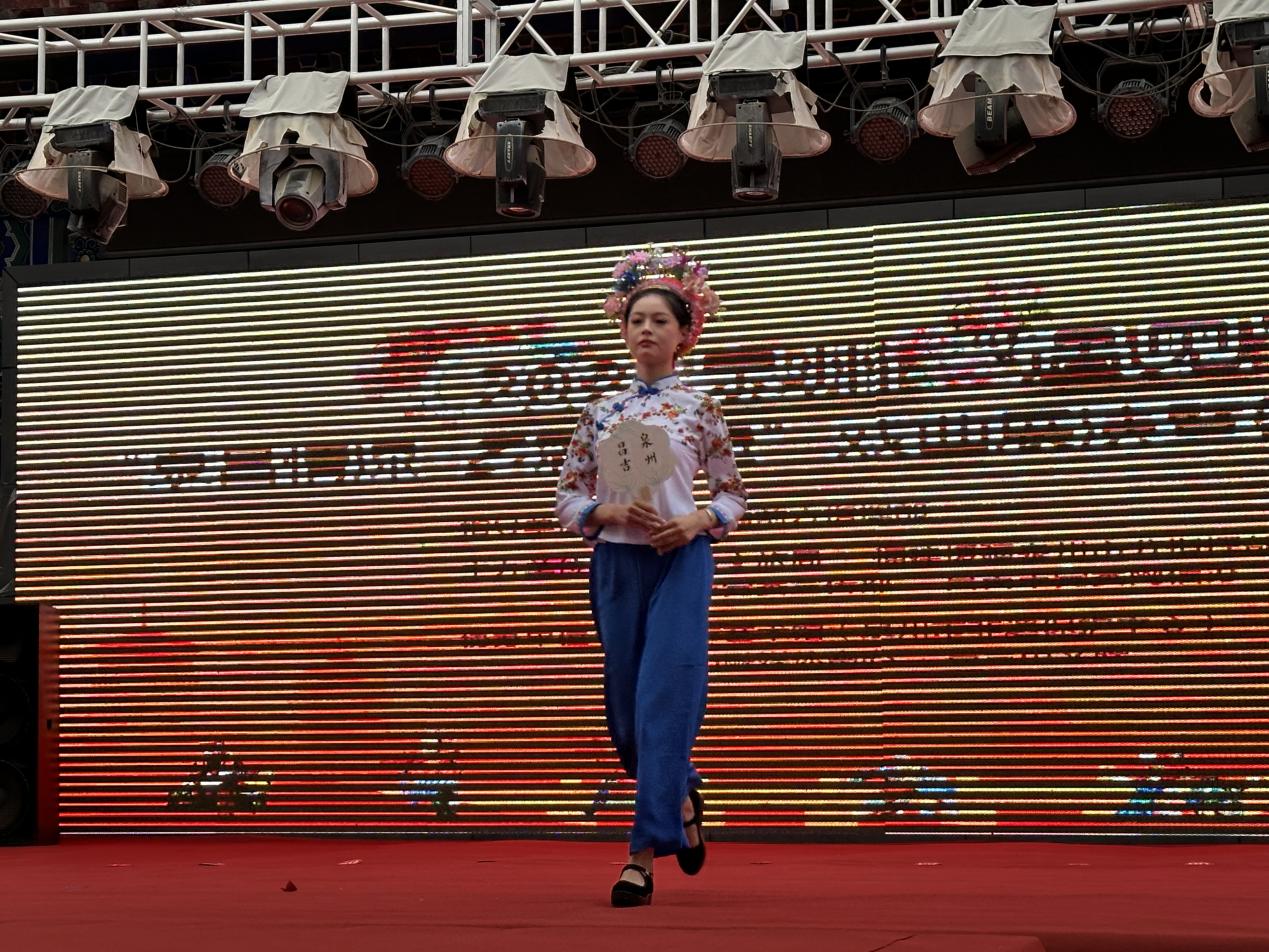 在非物质文化遗产项目表演环节,来自福建省泉州市的文艺工作者表演了福建省泉州市国家级非物质文化遗产项目高甲戏经典曲目《媒婆弄》、提线木偶表演《狮子舞》和蟳埔女簪花走秀等节目,富有闽南地域特色婉转动听的曲调、娴熟多彩的提线表演及婀娜多姿的舞姿,表现了泉州人民对美好生活的向往和追求,让在场观众感受到了中华传统服饰和非物质文化的独特魅力。