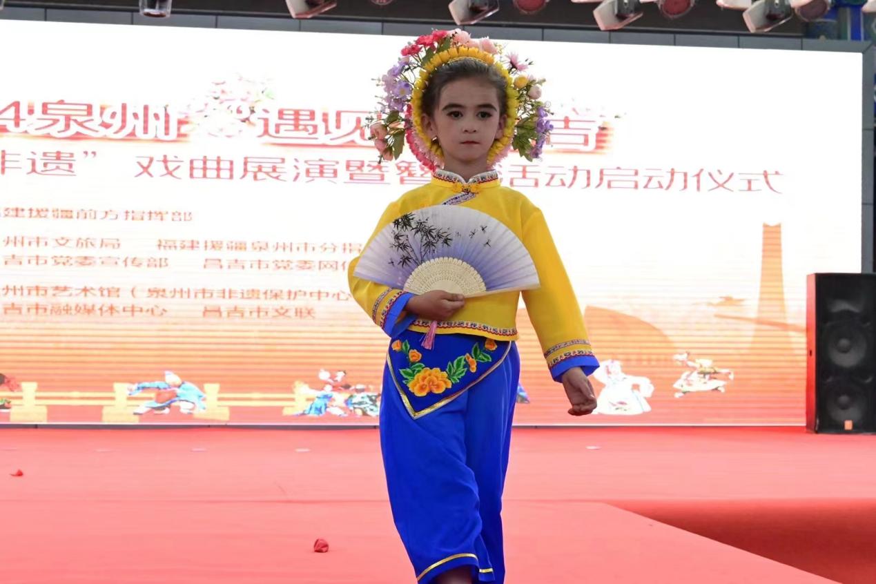 当天晚上,2024年“泉昌情深·多彩非遗”福建泉州戏曲主题展演活动还在昌吉市文化中心小剧场进行了首场演出。在演出现场,一曲富有新疆地域特色的舞蹈《情满西域》拉开了帷幕,随后,泉州市的文艺工作者表演了极具闽南特色的南音、掌中木偶戏、高甲戏、提线木偶戏等7个精彩节目,给现场观众带来了一场精彩的非遗文化盛宴。