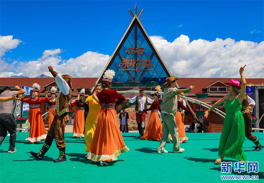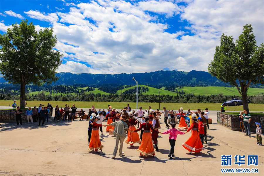 7月3日,在新源县花海那拉提景区入口处,各地游客与舞蹈演员一起跳舞。