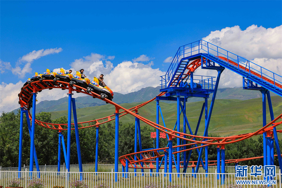 7月3日,游客在花海那拉提景区游乐园内体验各类娱乐设施。