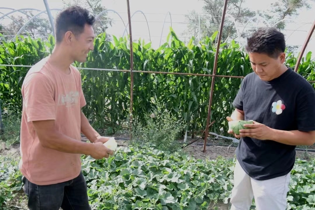 一八八团五连连长闫小东(右)和龙辉(左)查看西瓜长势。刘宇轩 摄