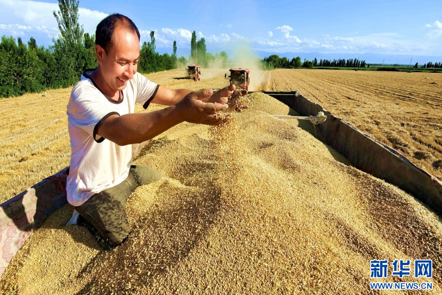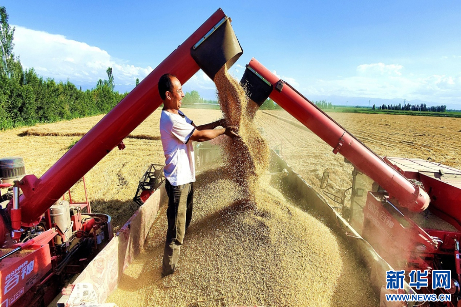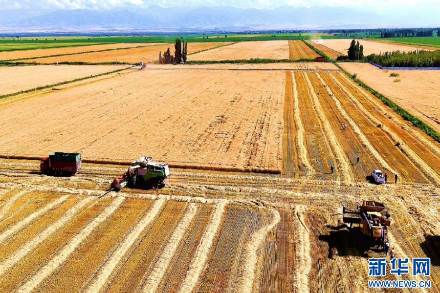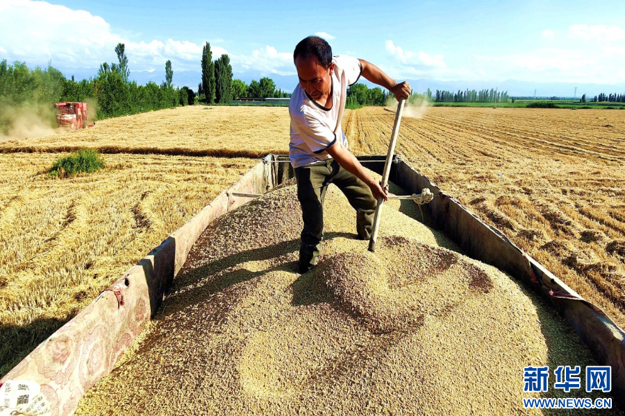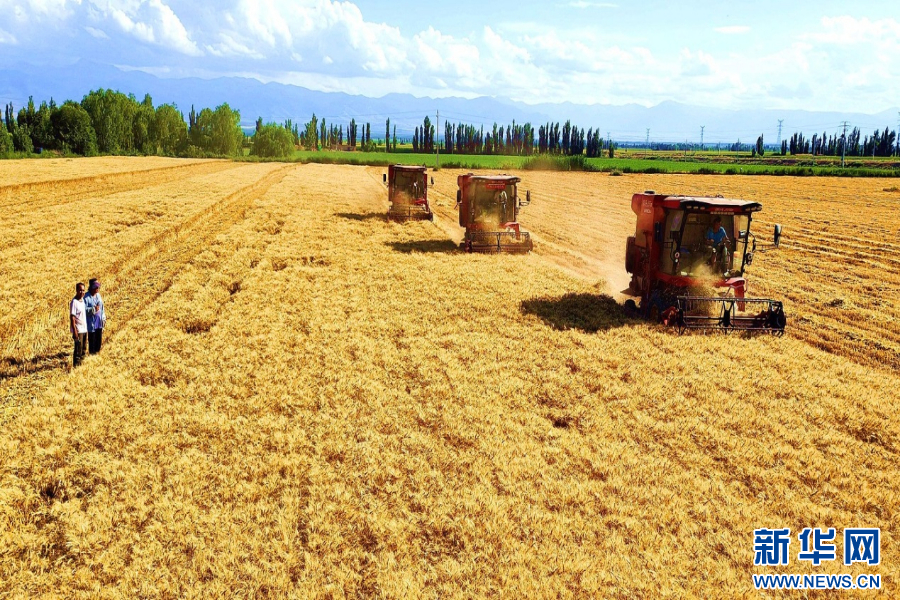 眼下,金色麦田穗飘香,新粮收割喜归仓。在新疆伊犁哈萨克自治州察布查尔锡伯自治县孙扎齐牛录镇阿帕尔村小麦种植基地,一望无际的成熟麦田“丰”景如画,让人心旷神怡。一台台联合收割机在麦浪间来回穿梭,金色的麦穗被卷进机仓,一趟趟满仓收割的麦粒直接倒入运粮车厢,粮农脸上洋溢着丰收的喜悦,田间地头一派繁忙的夏收景象。(华岩明)