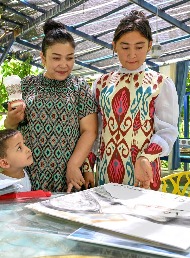 7月6日,在新疆克州阿图什市松他克镇阿孜汗村,村民在欣赏作品。