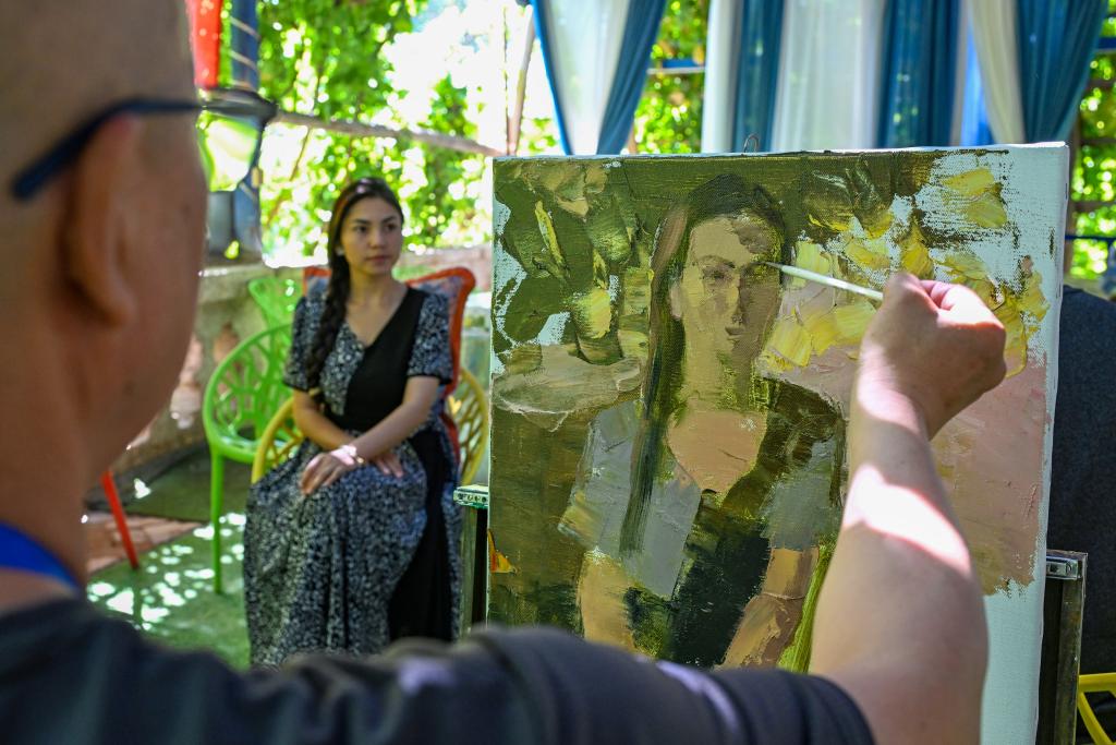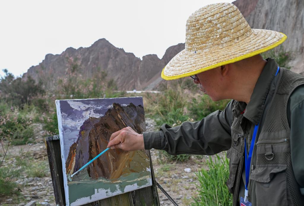 7月4日,在新疆克州阿图什市周边,小分队文化志愿者在写生创作。