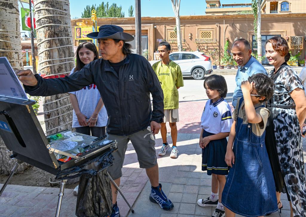 7月6日,在新疆克州阿图什市松他克镇阿孜汗村,村民在围观小分队文化志愿者写生创作。