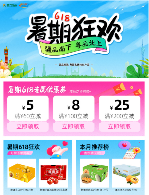 今年“618”期间,“疆品南下 粤品北上”线上主平台推出专属特惠活动。木亚格杏、伽师瓜等相继上市,线上促销随之启动,大额优惠券限时发送,让消费者得到实惠。据悉,平台根据重要消费节点和农产品上市季,推出线上主题月、直播秒杀等活动,丰富营销手段。