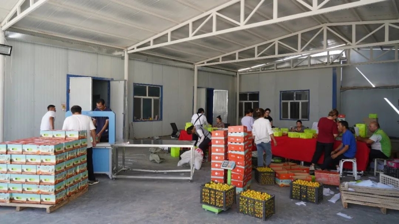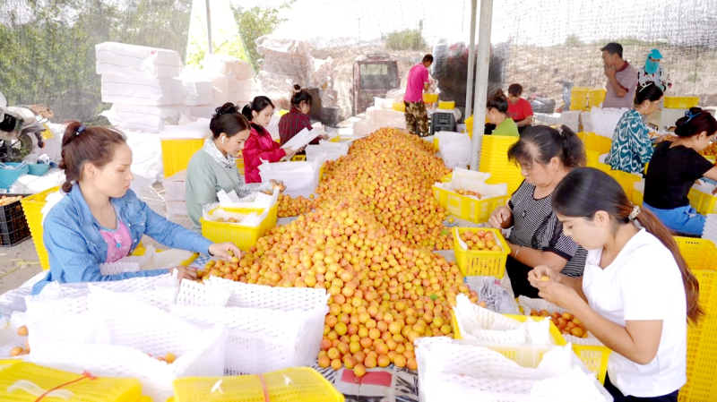 7月3日,在拜城县温巴什乡阿瓦提村吊干杏种植基地分拣包装区,40多名工人正有条不紊地对刚采摘下来的杏子进行分选、称重、包装。