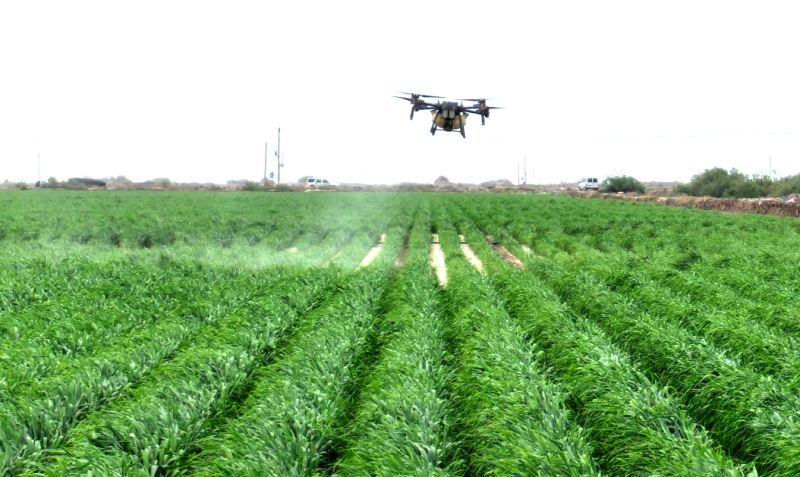 晌午时分,伴随着一阵轰鸣声,两架无人机有序地开展植保作业。迎着阳光,望着田地,伍书生嘴角上扬……(赵霞)