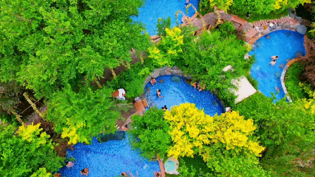 夏日的沙湾温泉,游客在户外汤池中泡汤。摄影:张海
