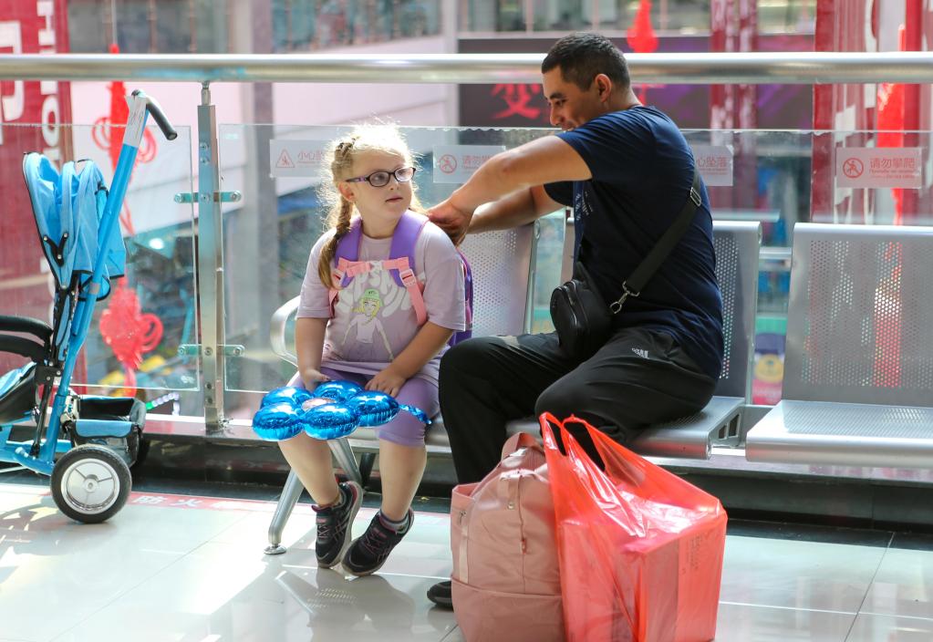 在中哈霍尔果斯国际边境合作中心,来自哈萨克斯坦的游客在购物后休息(7月26日摄)。新华社记者 林立平 摄