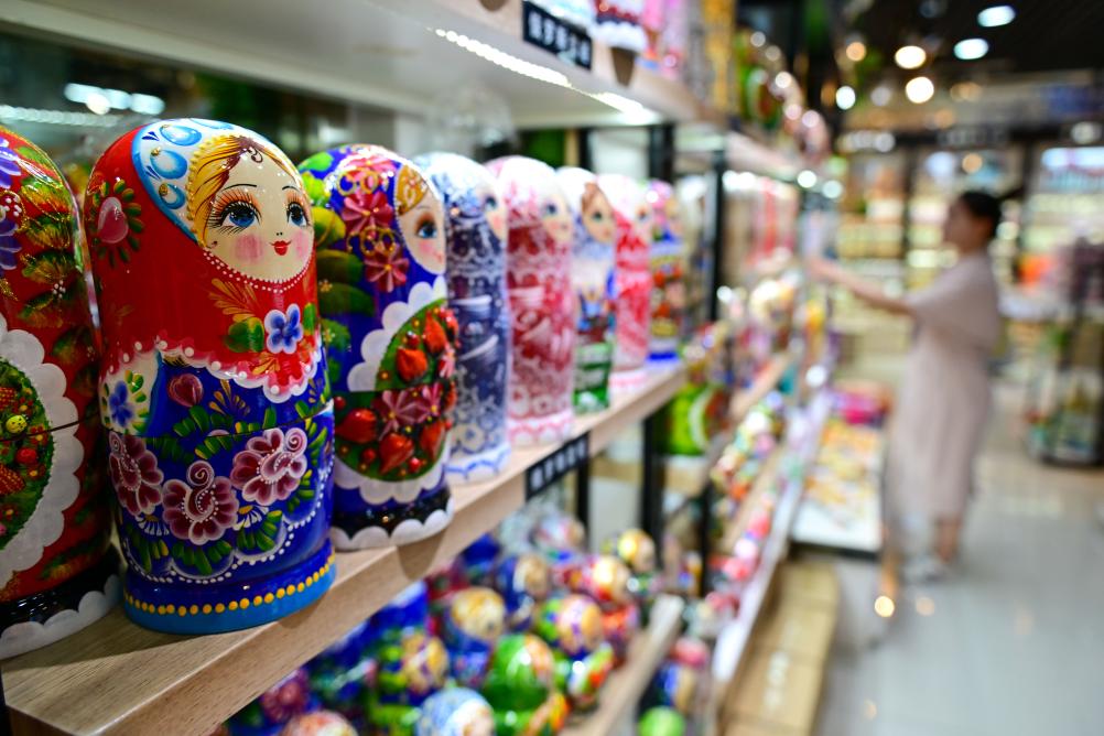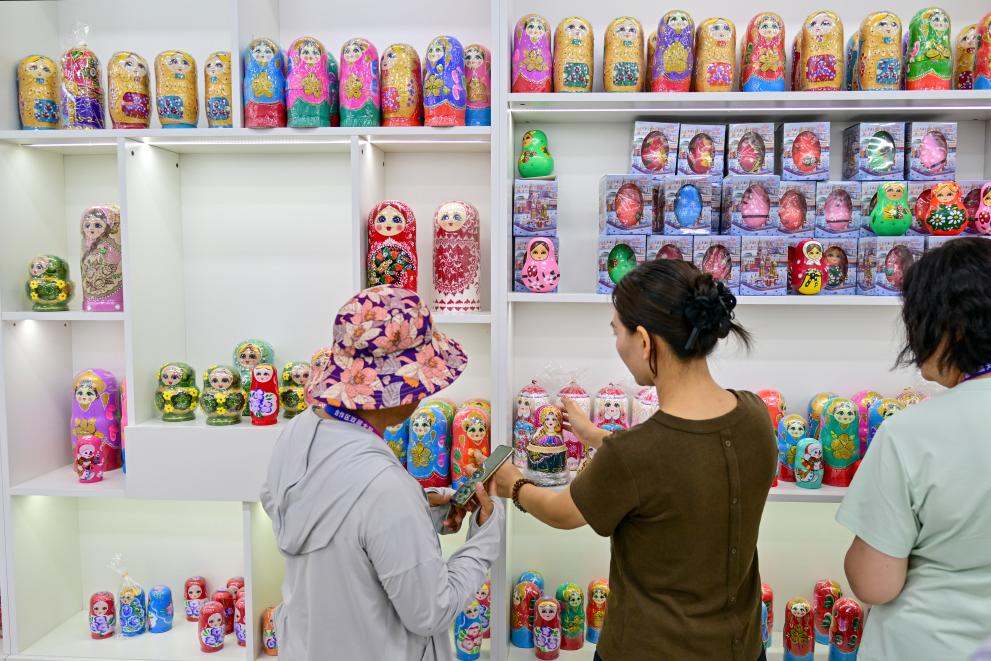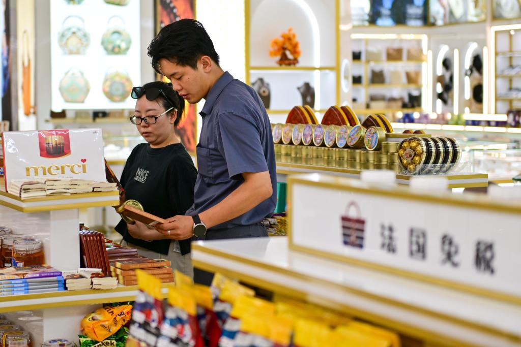 在中哈霍尔果斯国际边境合作中心,游客在免税店挑选商品(7月26日摄)。新华社记者 丁磊 摄
