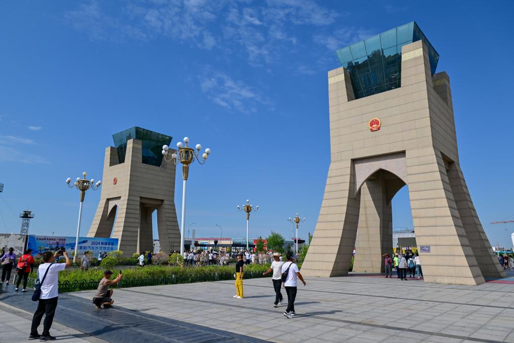 游客在中哈霍尔果斯国际边境合作中心联检大楼门前拍照留念(7月26日摄)。新华社记者 丁磊 摄