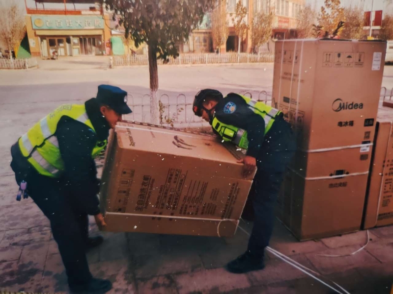 阿力木•热合曼(右)和同事热心帮助辖区商户搬运货物。 库车市公安局供图