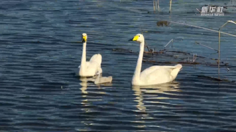 在新疆玛纳斯国家湿地公园,工作人员在监测中发现,野生大天鹅连续第二年在这里成功自然繁殖后代,幼年大天鹅在水面上嬉戏。