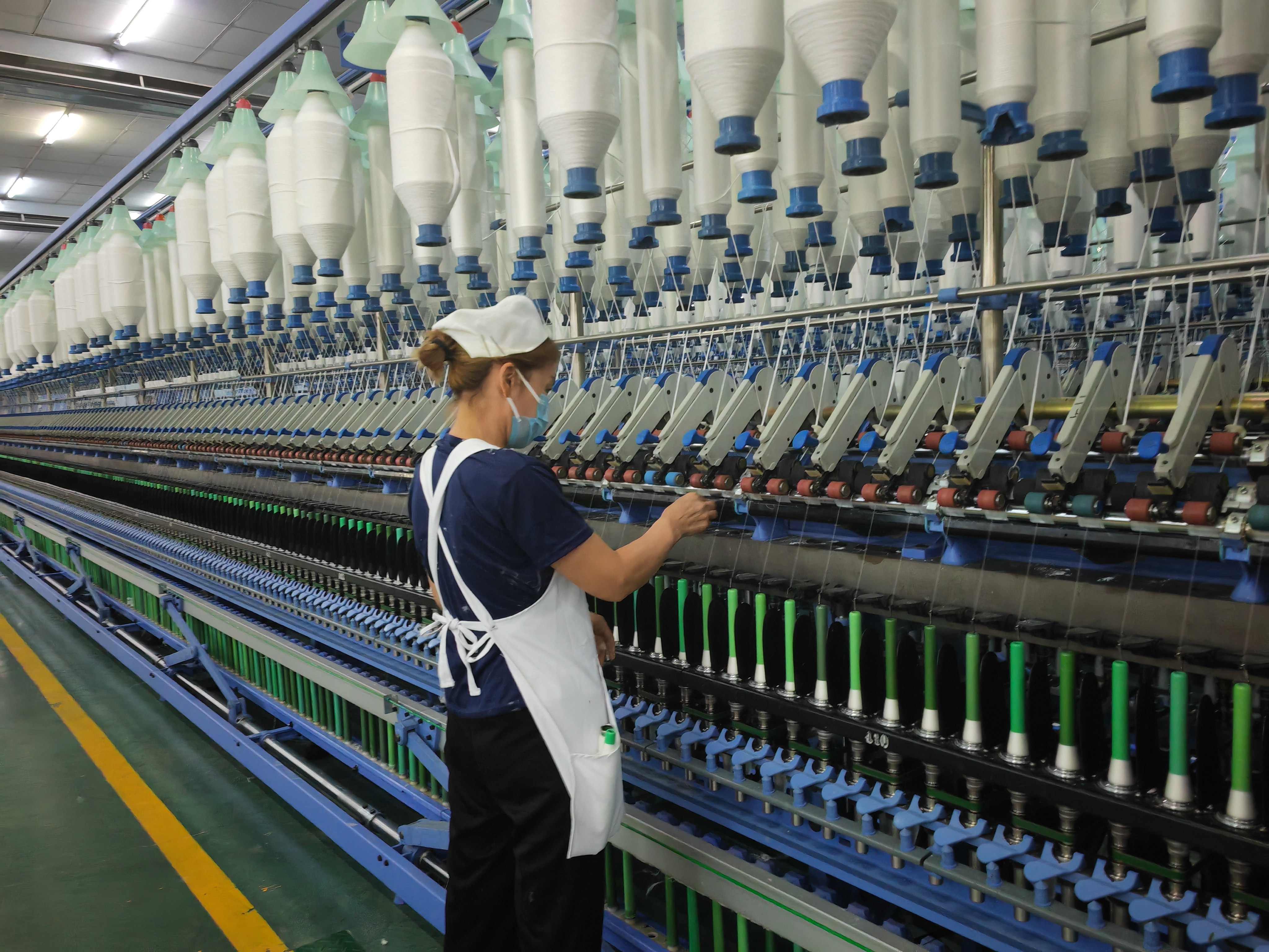 新疆兴泰纤维科技有限公司金沟河园区纺纱厂纺织工人在工作。