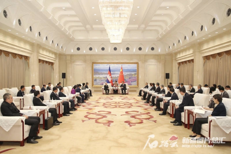 8月15日,自治区党委书记马兴瑞、自治区主席艾尔肯·吐尼亚孜在乌鲁木齐会见到访中国新疆的柬埔寨国王西哈莫尼。石榴云/新疆日报记者 崔志坚摄
