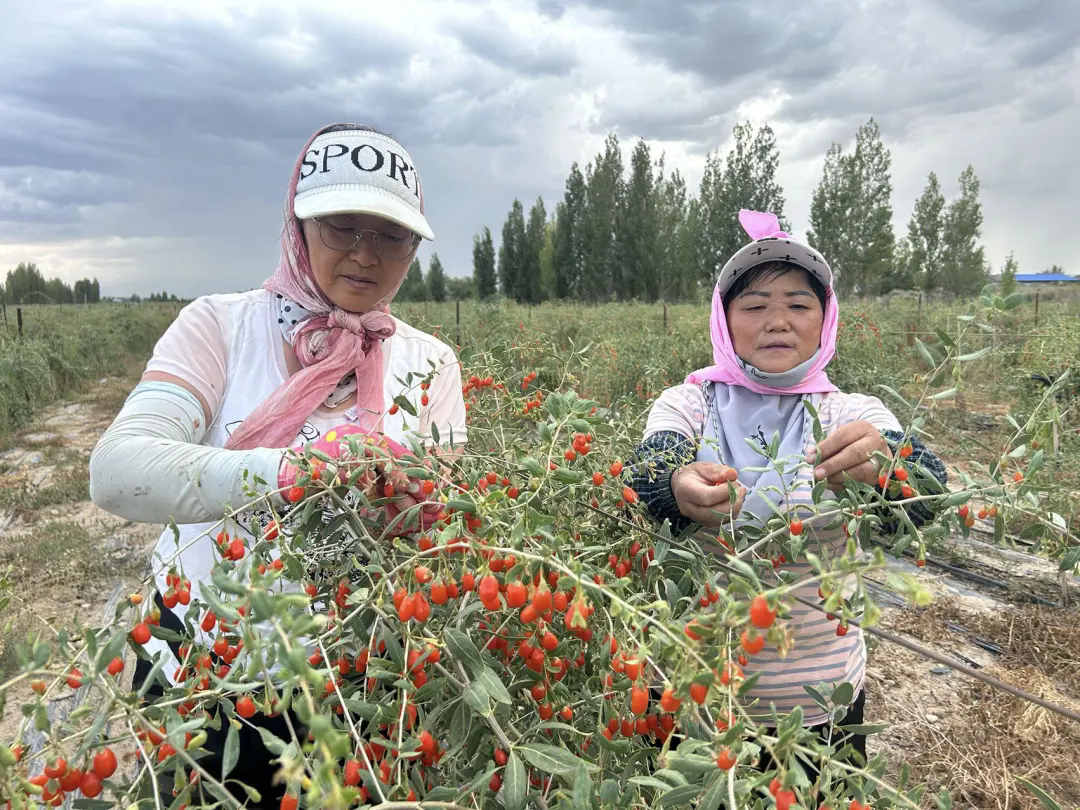 正值枸杞成熟的季节,职工们双手来回穿梭在结满果实的枝头间,动作娴熟地采摘枸杞鲜果。
