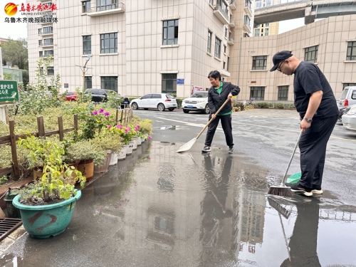 15时,在自治区交通运输厅住宅小区院内,水磨沟区六道湾街道五星北路社区工作人员正协同方益物业工作人员一起,疏通堵塞下水道,清理路面积水。