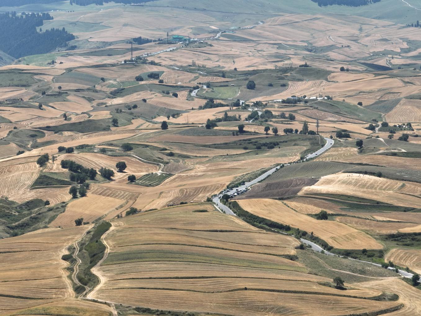 世代生活在江布拉克的人们像极了大地艺术家,他们以大地为画布,开垦出麦地,给江布拉克装饰了错综复杂、形态各异的几何图案:大地起伏,从天山之巅的冰川、高山草甸,再到浅山森林、谷地草原,最后在北麓的村庄和山野,随处是绿波麦浪,在空间的转换中看见四季颜色不断变幻。