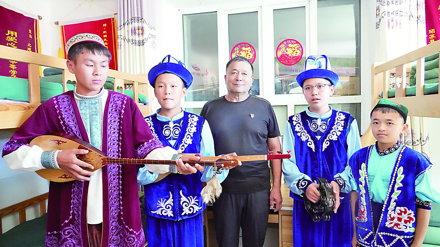 “红红的太阳照山岗,青青的草原亮堂堂。红旗红旗到处飘扬,幸福的花儿开心上……”走进伊犁哈萨克自治州特克斯县“沈建佳工作室”,一位体格健壮、皮肤黝黑的西北汉子被4个孩子围坐在中间,孩子们弹起冬不拉,拉着手风琴,欢快地唱着柯尔克孜族民歌《幸福的花儿开心上》。