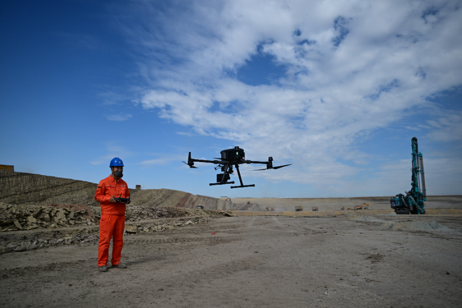 工作人员操控无人机对矿区进行测绘。刘康摄