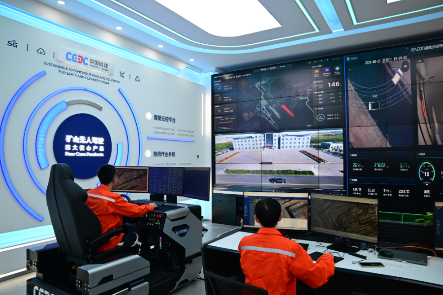 在五彩湾一号露天煤矿现场,一辆辆白色无人驾驶矿卡正在矿区中精准作业,而负责“驾驶”它们的3位驾驶员,则坐在距离现场几公里外的控制室内,监控数十台无人矿卡有效运行。