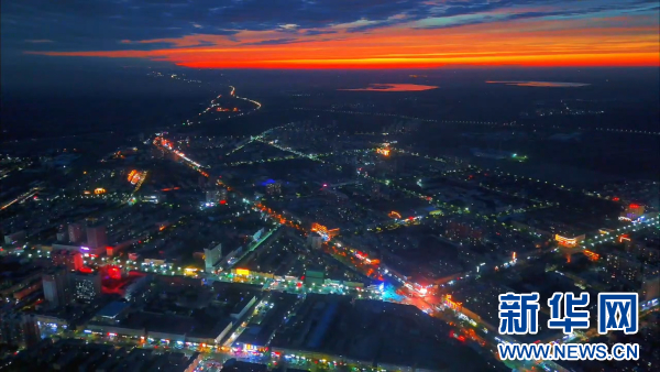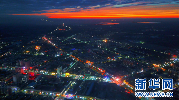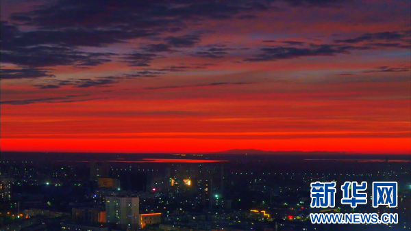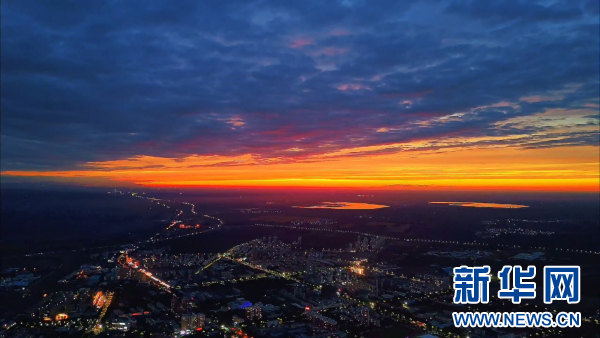 城市的霓虹灯悄然亮起,与晚霞交相辉映。张海摄影